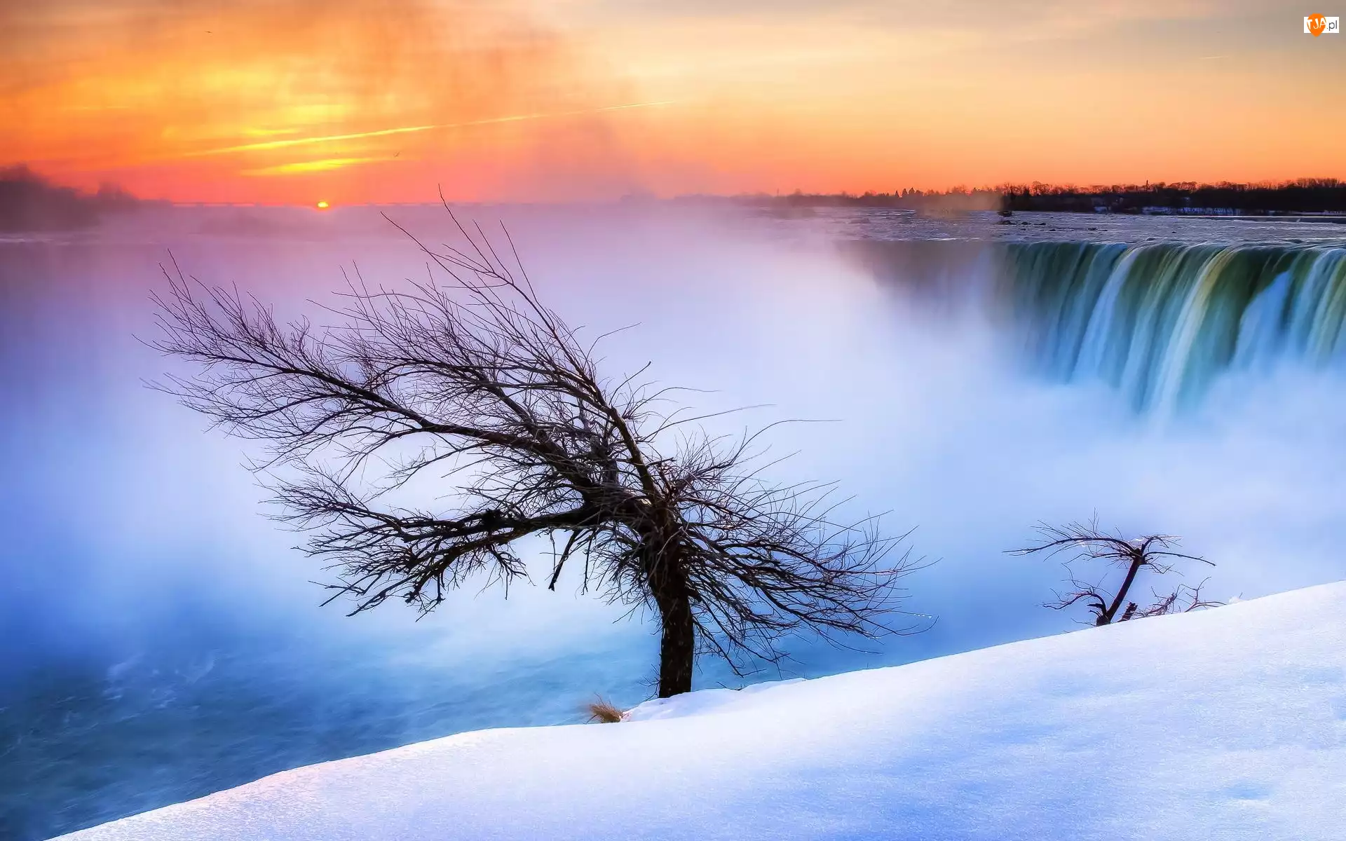 Zima, Wodospad, Wschód, Drzewo, Słońca