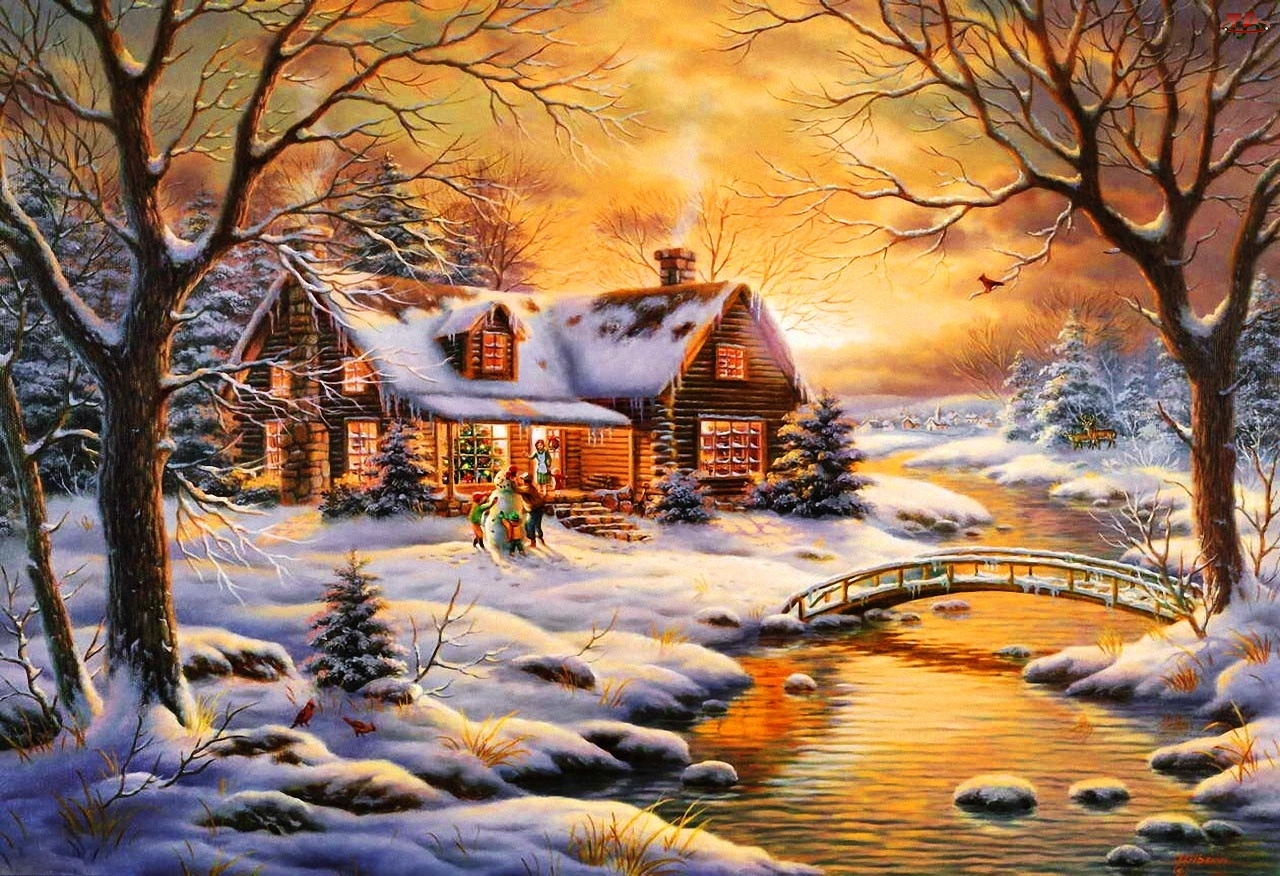 Zima, Zachód, Rzeczka, Słońca, Domek