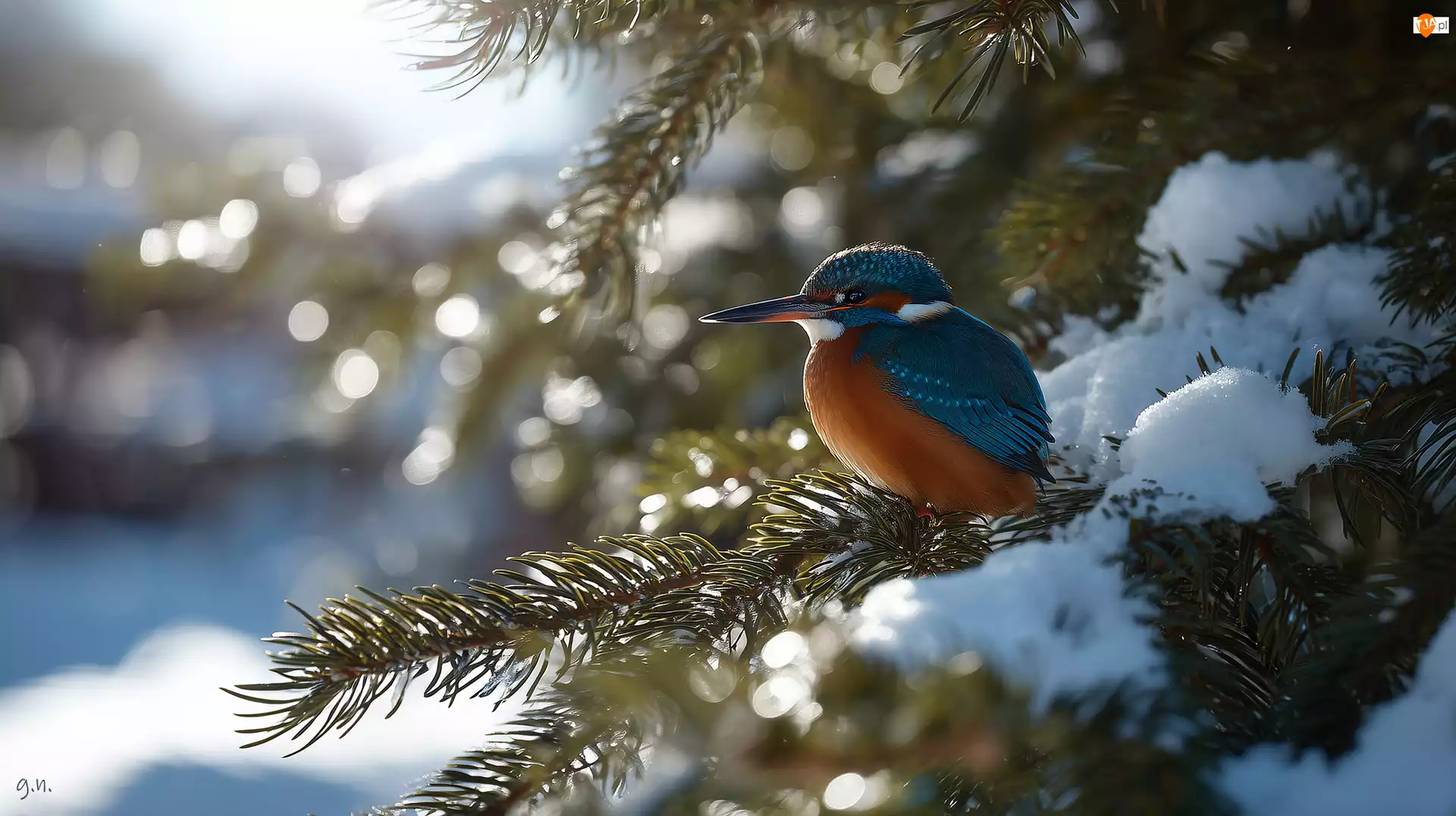 Śnieg, Grafika AI, Świerk, Zimorodek, Zima