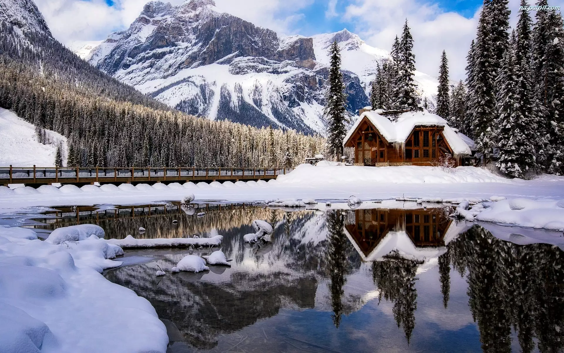 Drzewa, Kanada, Jezioro Emerald, Dom, Park Narodowy Yoho, Most, Zima, Góry