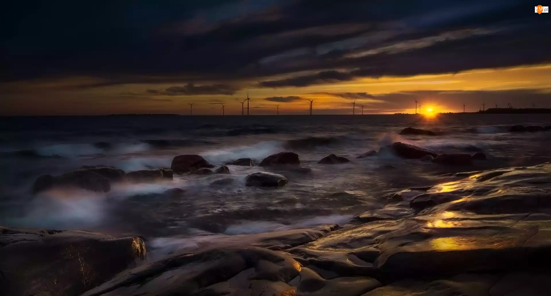Skały, Finlandia, Miasto Pori, Zachód słońca, Morze Bałtyckie, Wyspa Reposaari, Wiatraki, Zatoka Botnicka