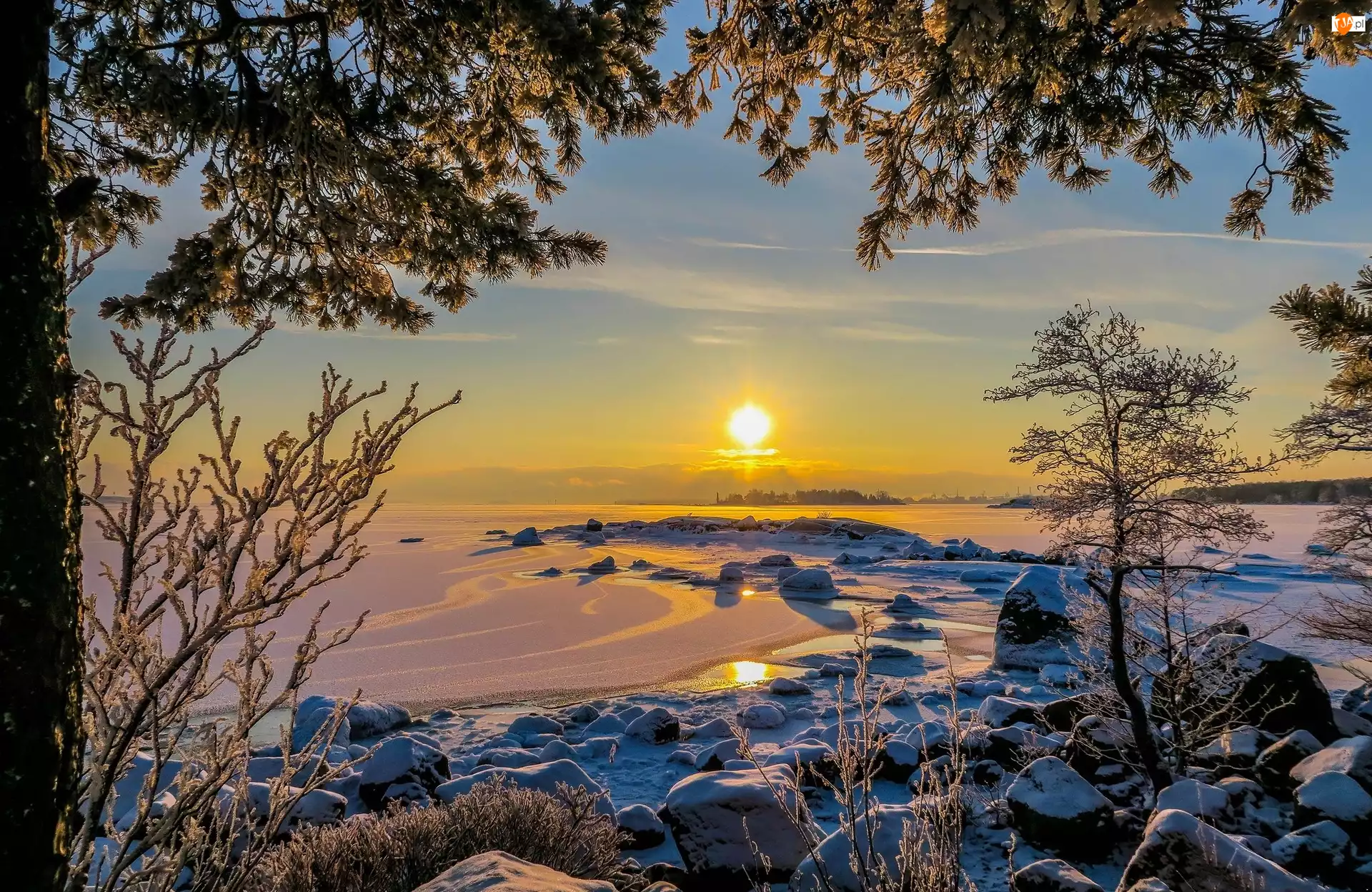 Morze Bałtyckie, Zima, Kotka, Kamienie, Finlandia, Promienie słońca, Zatoka Fińska, Drzewa