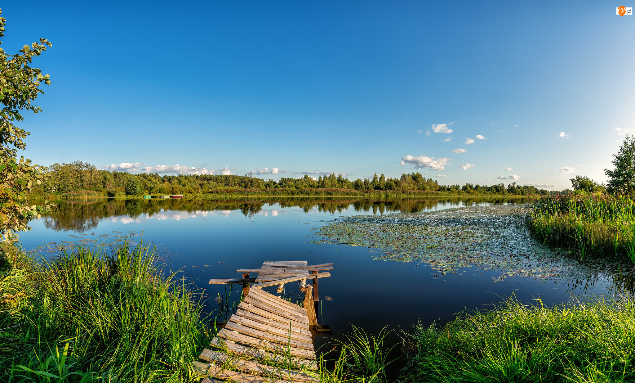 Szuwary, Lato, Pomost, Jezioro, Drzewa