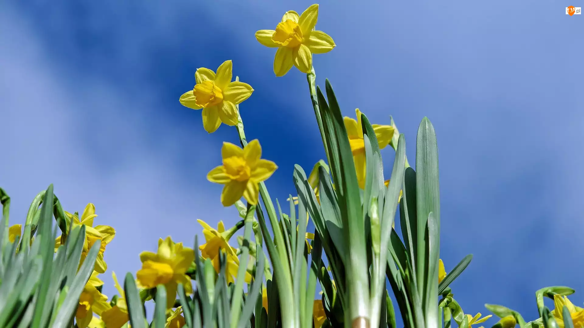 Żółte żonkile na tle błękitnego nieba