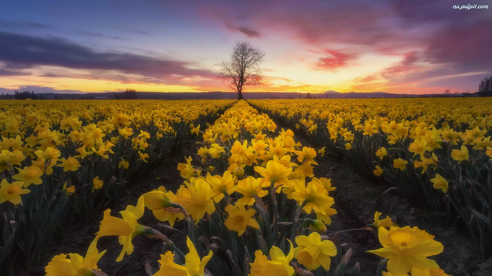 Drzewo, Narcyzy żonkile, Stany Zjednoczone, Dolina Skagit Valley, Stan Waszyngton, Zachód słońca, Pole